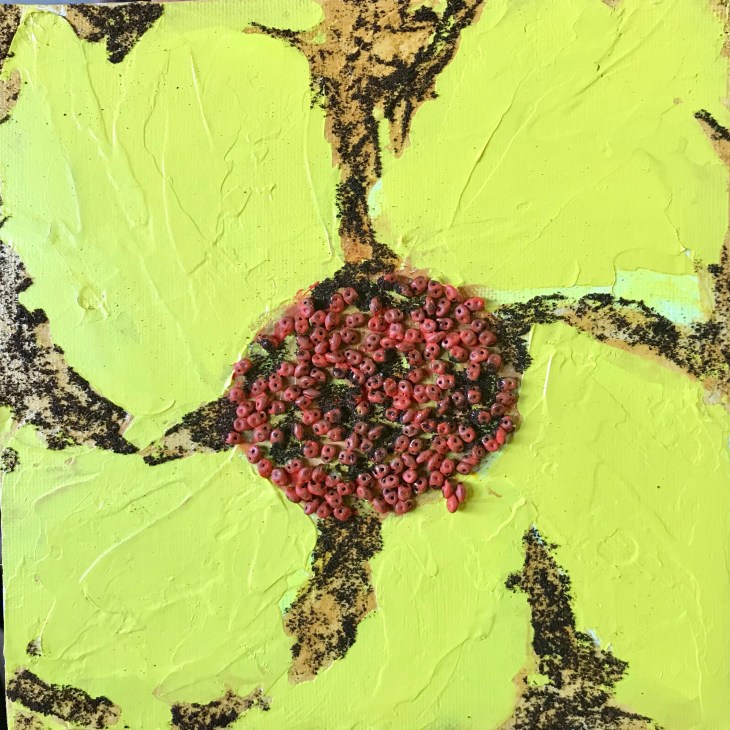 Sunflower, 8×8 Acrylic, coffee, beads on acrylic panel